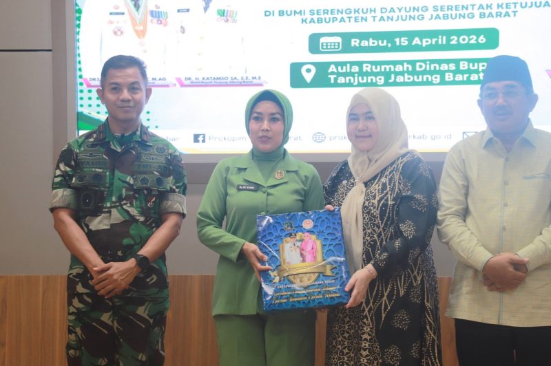 DEWARTA.COM, TANJAB BARAT – Bupati Tanjung Jabung Barat, Drs. H. Anwar Sadat, M.Ag., didampingi Ketua TP-PKK Hj. Fadilah Sadat, S.H., menyambut hangat kunjungan kerja Komandan Resor Militer (Danrem) 042/Gapu, Brigjen TNI Nyamin, S.IP., M.M, bersama Ketua Persit Kartika Chandra Kirana Koorcab Rem 042 PD XX/Tuanku Imam Bonjol, Ny. Ine Nyamin, beserta rombongan. Kegiatan tersebut berlangsung di Rumah Dinas Bupati Tanjung Jabung Barat, Rabu (15/04/26).